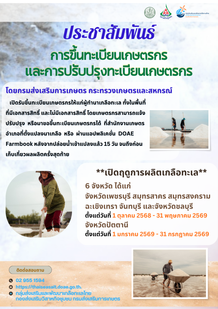 โดยกรมส่งเสริมการเกษตร กระทรวงเกษตรและสหกรณ์ เปิดรับขึ้นทะเบียนเกษตรกรให้แก่ผู้ทำนาเกลือทะเล ทั้งในพื้นที่ที่มีเอกสารสิทธิ์ และไม่มีเอกสารสิทธิ์ โดยเกษตรกรสามารถแจ้งปรับปรุงหรือมาขอขึ้นทะเบียนเกษตรกรได้ที่สำนักงานเกษตรอำเภอที่ตั้งแปลงนาเกลือ หรือ ผ่านแอปพลิเคชั่น DOAE Farmbook หลังจากปล่อยน้ำเข้าแปลงแล้ว 15 วัน